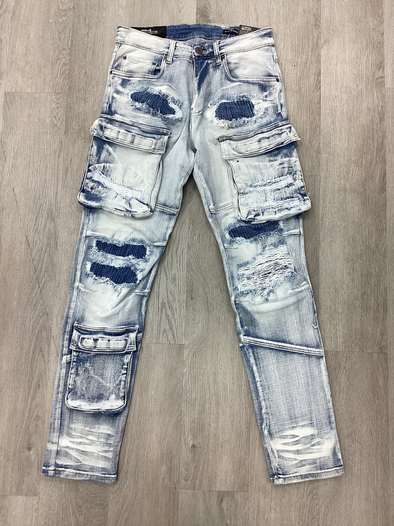 Light Wash Cargo Jeans - Distressed Ripped Patchwork Denim